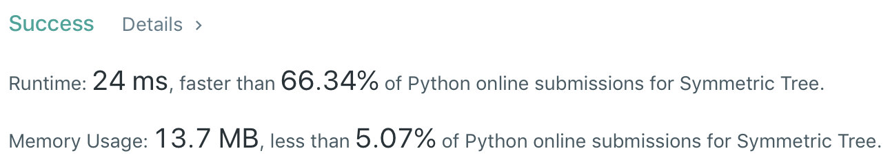 return left.val == right.val and isSubtreeSymmetric(left.left, right.right) and isSubtreeSymmetric(left.right, right.left)