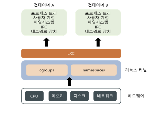 - 하드웨어 자원들을 cgroups를 통해 할당하고 namespace를 활용하여 프로세스나 IPC 등을 격리시켜 별도의 공간을 만드는 형태