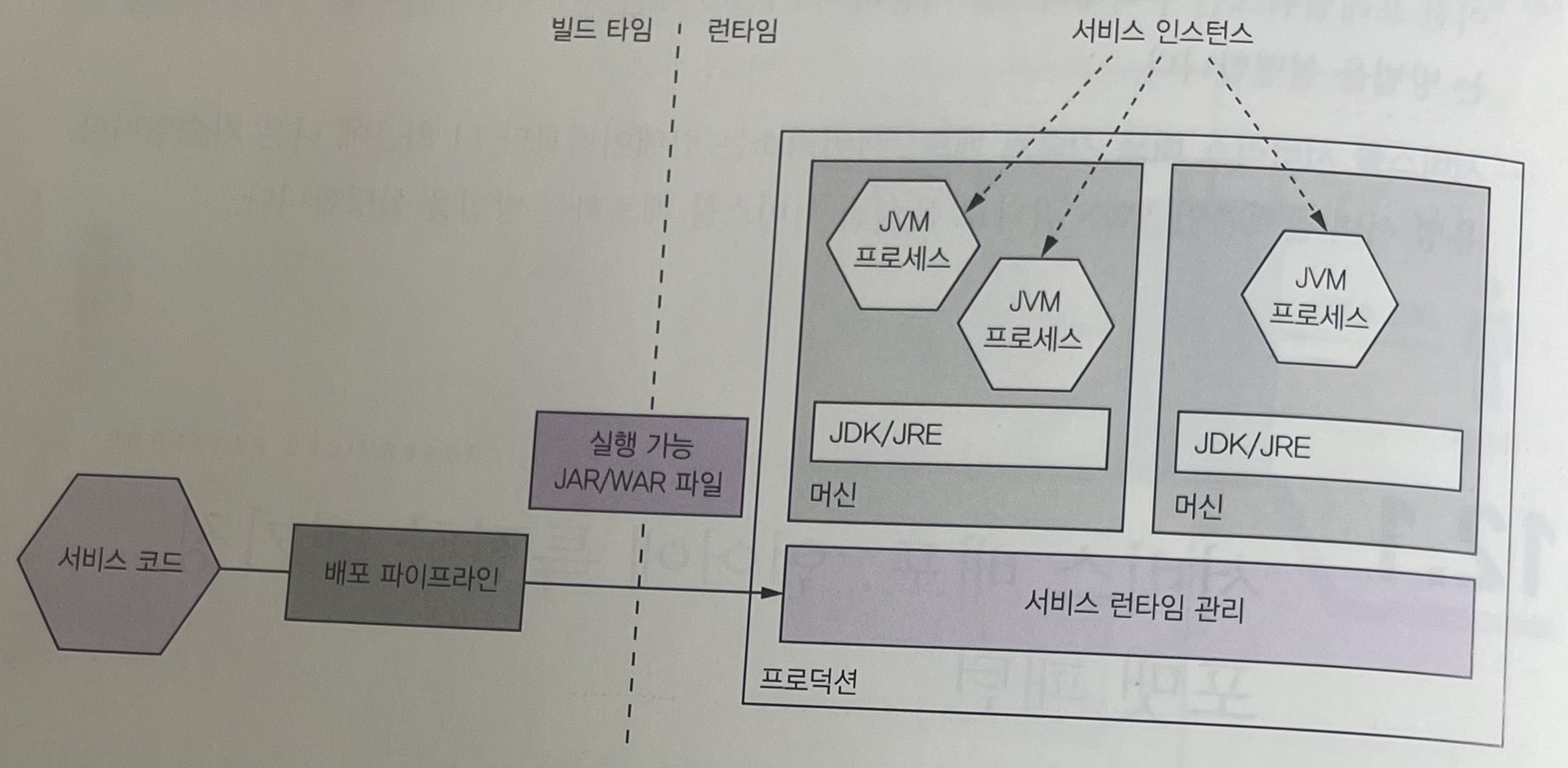 - 상대적으로 무거운 자바 기반 서비스라면 크게 문제되지 않지만, 가변운 Node.js나 고 언어 서비스라면 비효율적인 배포 방식
