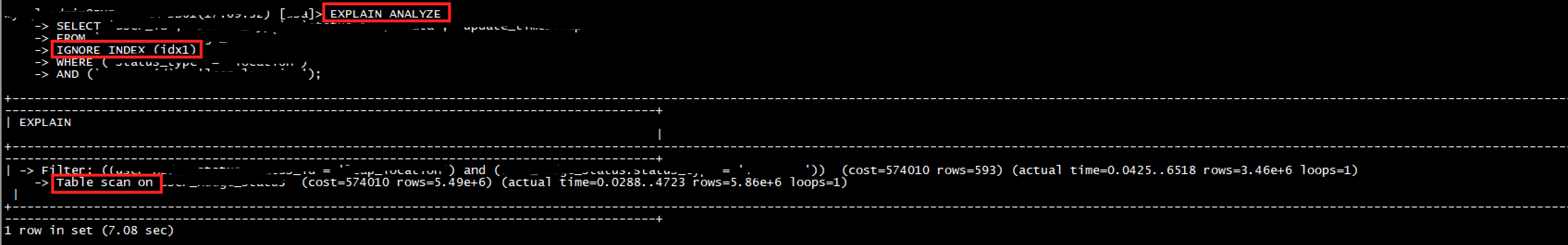 Table Scan 단계에서 5860000 rows를 읽지만, filter 단계에서 실제 사용하는 rows는 3460000으로 240000만큼 데이터는 쓰이지 않고 버려졌다. (여기서 비효율을 발견하고, 인덱스를 만들어야 겠다고 생각했다!)