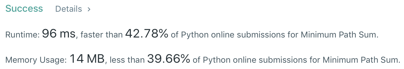 따라서 이 문제는 동적 프로그래밍으로 풀기에 적합하다. 각 칸까지의 경로의 최소 합을 저장하고, 다음 칸의 값을 구할 때 이전 값들을 사용하면 된다. 즉, dp[i][j] = min(dp[i-1][j], dp[i][j-1])+ grid[i][j]. (물론, 예외처리는 해주어야 한다.)